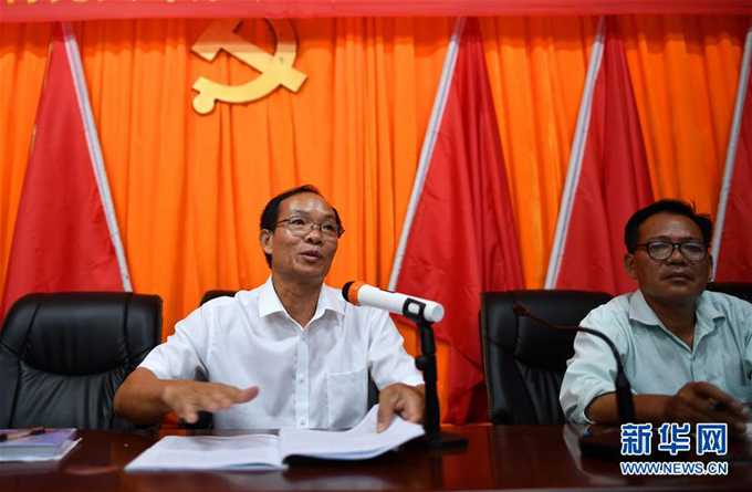 2017年9月28日晚,羊风极(左)在海南省白沙黎族自治县打安镇田表村村委会组织党员进行“两学一做”学习教育活动