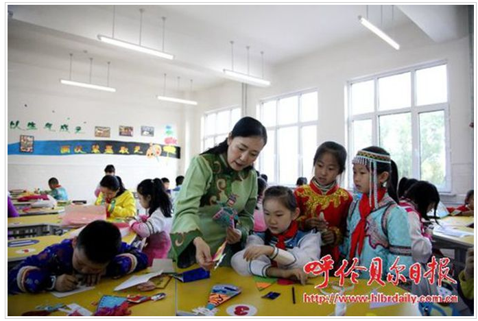 苏梅在莫旗民族实验小学,指导孩子们制作达斡尔族玩偶哈尼卡
