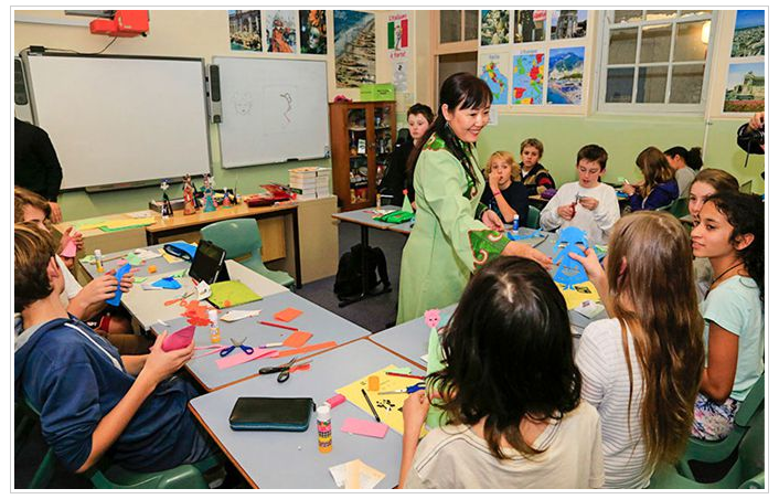 2014年7月,苏梅把精美绝伦的“哈尼卡”剪纸艺术带给了澳大利亚悉尼莫斯曼中学的学生们 (贺吉 摄影)