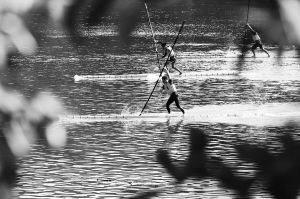“独竹漂”又称“划竹竿”,运动员赤足站立于一根楠竹上,以小竹竿当桨,在水上漂行如履平地,有“一苇渡江”之妙。
