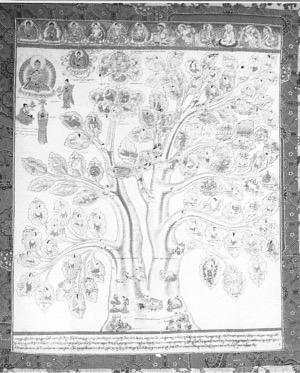 藏族“汤卡”的绘制有一个特点,就是不注明绘制日期或绘制人的姓名(除个别的“曼汤”外),但藏族“曼汤”却另有特点,就是在“曼汤”的最上方留有一定位置来绘制医学中的重要人物,特别是古代医学家。藏族古代医学家往往也是宗教人物。