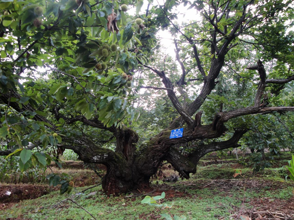 一是:徐霞客在农历八月十五的时候来到寻甸,第一次尝到了炒板栗,认为这是人间美味的他,顺手抓了一把混杂生熟的栗子就放进兜里。步行数月后,在腊月来到了当时的凤尾村(寺前村),受到热情款待的徐霞客身上的盘缠不多了,为了表达谢意,就把栗子送给了农户去播种,因为栗子有些受潮发霉,所以仅仅成活了几棵。但是到了现在,以及连成了一片古树林。