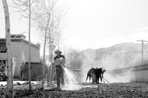 茶馆老板正在修建房屋前的草坪。