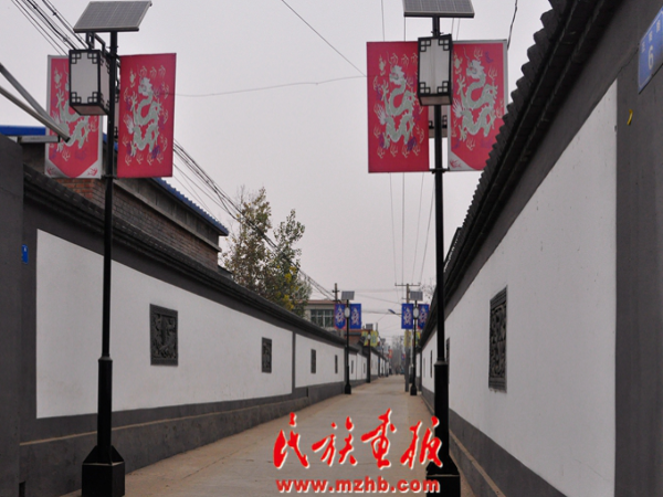改造后的福山营村街道,体现满族文化的八面旗帜随处可见