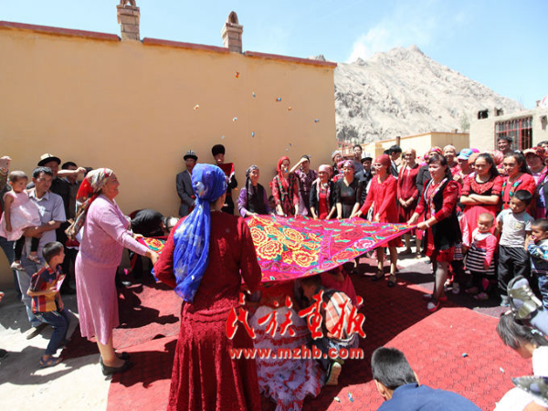 乌尔都隆窝孜村离乡政府不远,到达这里时,两排土黄色的牧民新居与远处的昆仑山已经让我们感受到浓浓的别样风情。其中一户门前人头攒动,聚满了很多人。不用说,这里就是举办婚礼人家的住处。