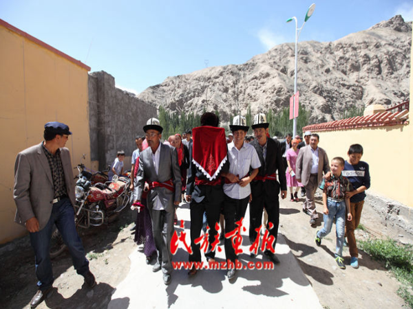不一会儿,外面热闹声一片。原来是迎亲队伍来了!只见新郎用一块红布遮住了脸,在众人的簇拥下,缓慢前行。新郎的左右站了三位伴郎,他们一边走,一边唱起柯尔克孜族最具代表性的民间口头文学“约隆歌”。每走几步,新郎都会伴着歌声的旋律和手势鞠一下躬。新郎和伴郎腰间各系有一块红布,他们边走,后面几个新娘家的姐妹就要不时抓住他们腰间的红布,往后拉一下,尽量不让他们走得太快。其原因是希望他们多唱歌、多鞠躬,以表达对女方的尊重。