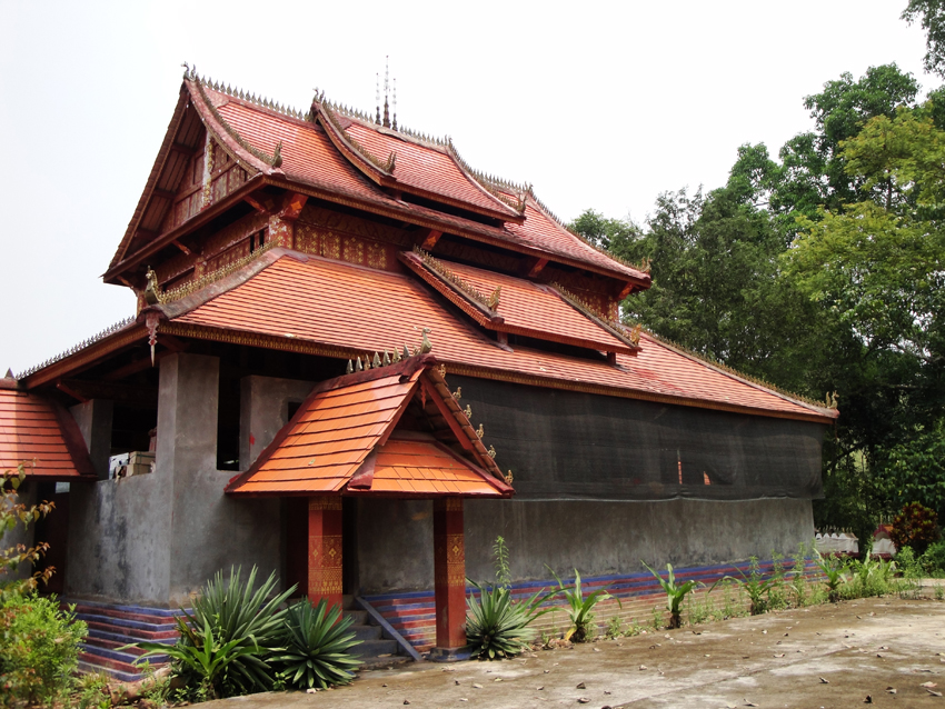 佛寺建筑是信仰小乘佛教的傣族地区建筑的一大特色,以落地重檐多坡面平瓦建筑为主。由大殿、僧舍和鼓房组成,中心佛寺外加一座戒堂、一座藏经楼、一座佛塔。主殿外观一般是单檐或重檐歇山式屋顶,或悬山式顶、多角或亚字形重檐歇山式顶。坡面进行一至二次跌落后有两层或上中下三层的单面坡或三面坡、五面坡,坡面的多少和佛寺的级别有关。屋面按纵向分为两段式或三段式或五段式,以中间最高,使庞大威严的屋面呈现出优美起伏的曲线。
