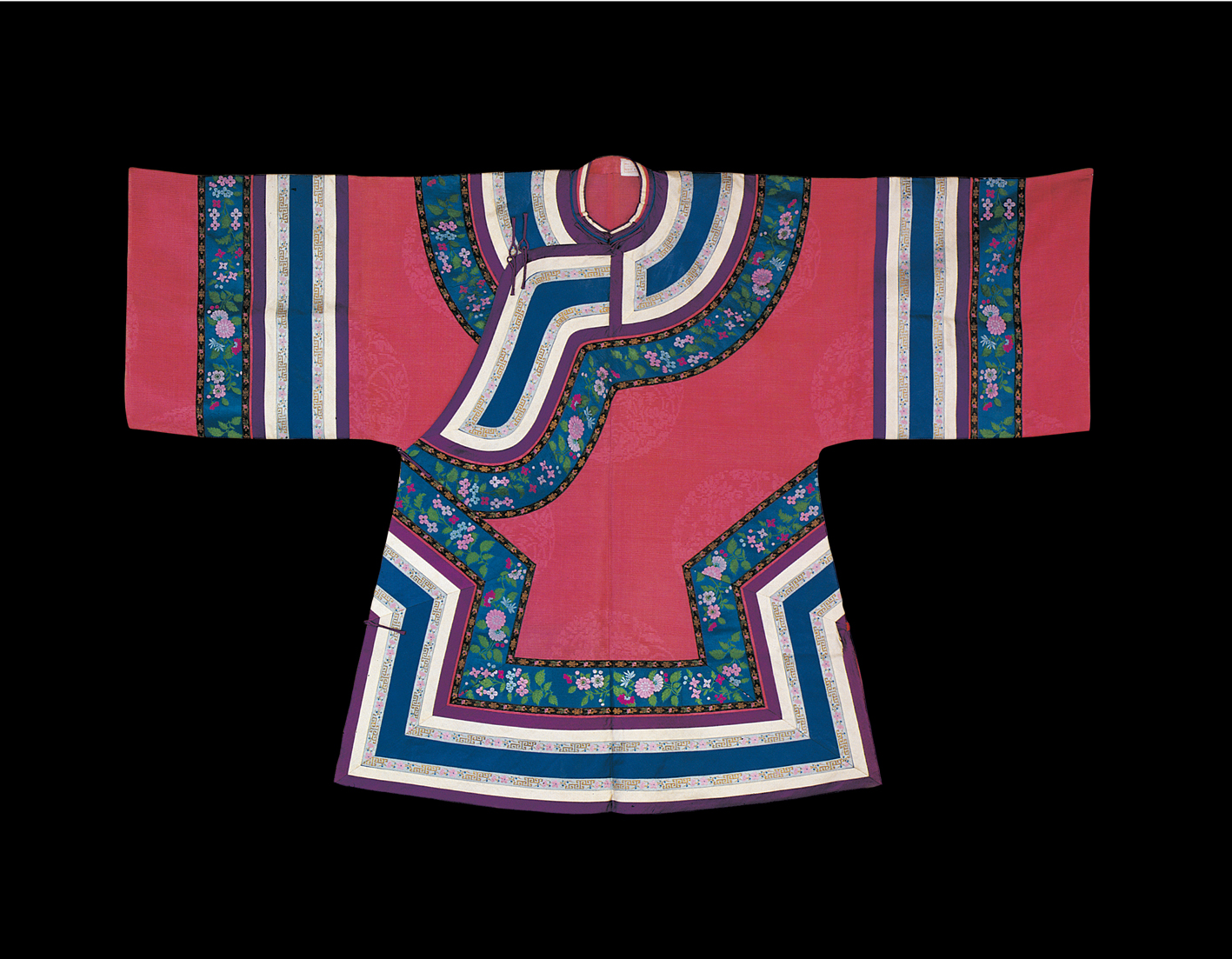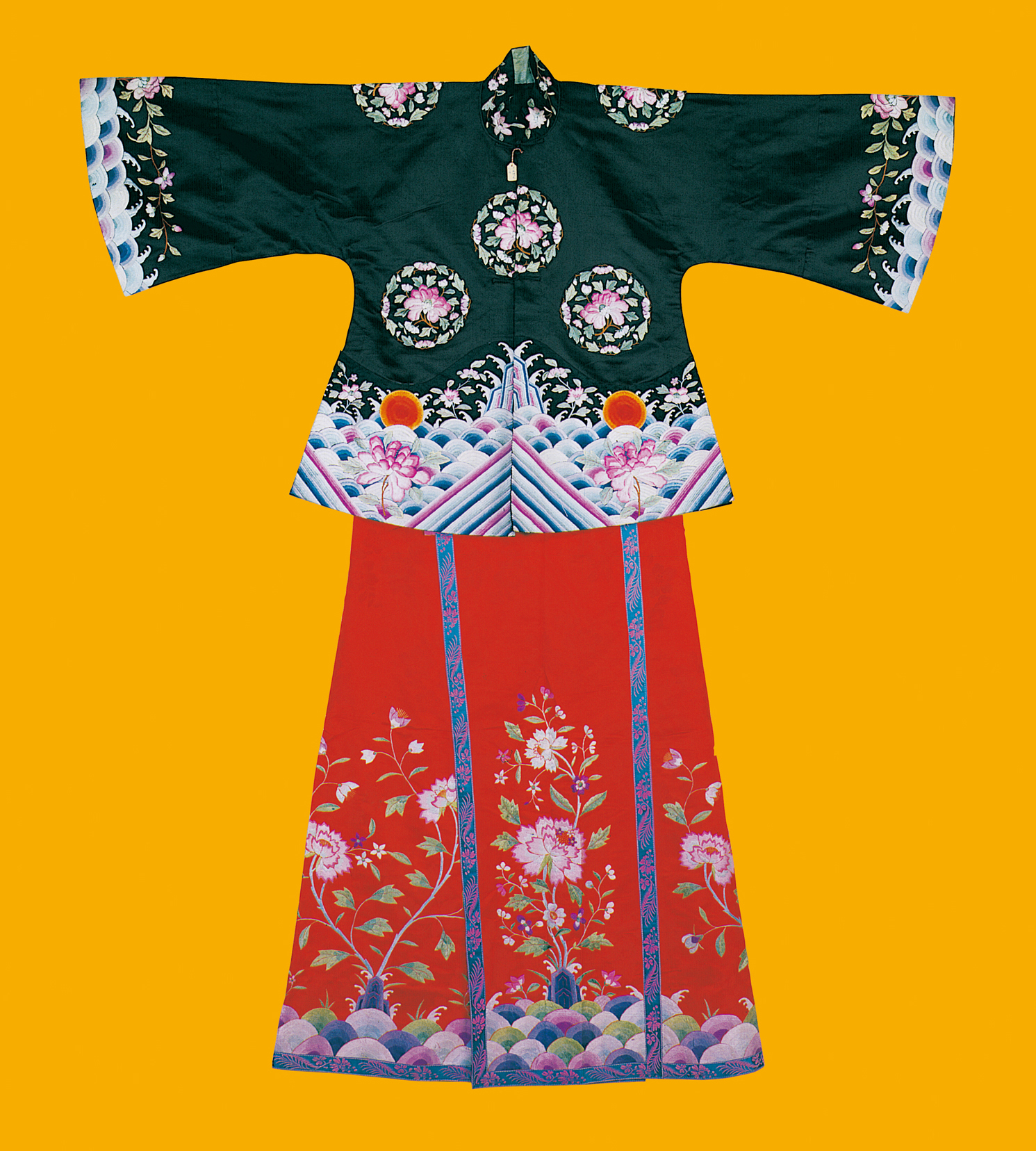元代,作为民族大融合和中外文化大交流时期,长衣统称为袍,其样式南北方差异不大,但材料贵贱精粗,却差距悬殊。汉族男性发式变化不多,但北方的汉族女性发式较前简化。在元朝并没有完整的冠服制度。蒙古人入主中原后仍保持其生活习俗,但同时又受汉族的影响,服饰日趋华丽。在大宴活动中,天子百官要穿统一颜色的服装,称为“质孙服”,其形为袍袄状,与汉族深衣相近(图为汉族清代牡丹纹缎绣女装,中央民族大学民族博物馆馆藏)。