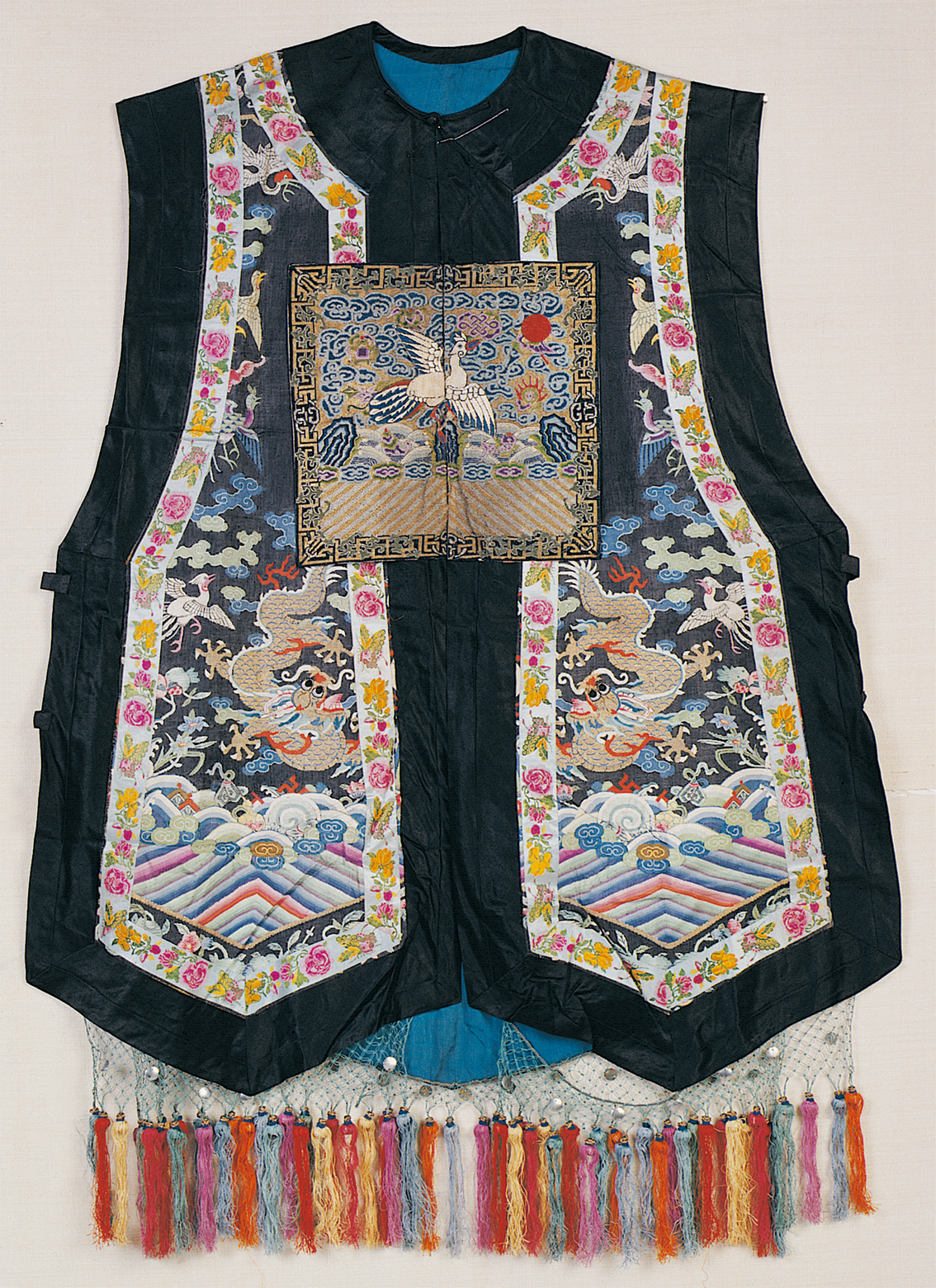 《史记·五帝本纪》载:“黄帝之前,未有衣裳屋宇。及黄帝造屋宇,制衣服,营殡葬,万民故免存亡之难。”在五千多年前的新石器时代仰韶文化时期,可能就产生了原始的农业和纺织业,开始用织成的麻布来做衣服。据传,黄帝之妻嫘祖发明了饲蚕和丝纺,衣冠服饰基本成制。殷商西周,冠服制度逐渐完善,春秋战国时期,衣冠款式走向多元,冠服制被纳入“礼治”范畴,从此汉族衣冠服制更加详备。中原地区还出现了胡服戎装,甚至相沿成风(图为汉族清代七品文官女朝褂,中央民族大学民族博物馆馆藏)。