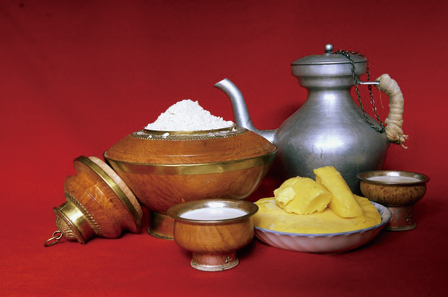 藏族地处高海拔地区,在特殊的环境下形成了特殊的食材和饮食习俗。藏族的主要食品是青稞糌粑、牛羊肉和奶制品。这些都是藏区特有的食品。
