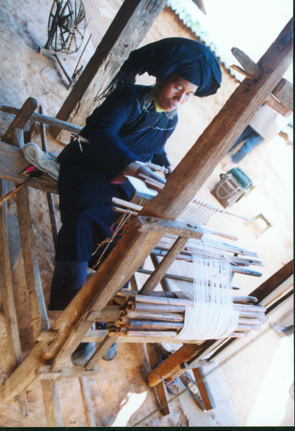(2)纺织。布朗族妇女善于纺织,多在闲暇时间进行。纺织原料有棉花、苎麻和葛线麻等数种,以纺织棉布为主。这些布用来缝制上衣、筒裙、背带、布袋、裹脚布等。纺织品种有斜纹布、平布和彩锦。布的质地厚实耐穿,深受本族人喜爱。有的地区,人们多半使用水平织机,纺织技术更进了一步。近十年来,由于价廉物美、品种齐全的化纤纺织品大量销售,传统的纺织技术受到了冲击,一些布朗族妇女已经不纺纱织布。