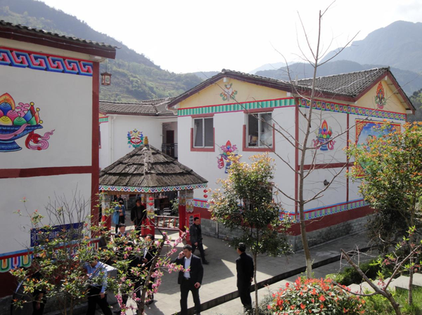 行走在乡间小道上,别样的唐卡画、雕龙画凤房檐镶嵌在房屋之顶,让人如入人间仙境陶醉其中。沿着整洁的水泥路,穿过一座座古香古色的农家房屋、木制篱笆院,来到农户门前,整洁亮丽的房屋屹立在宽敞的庭院内,太阳能浴室、现代化厨房、干净的卫生间展现在眼前。