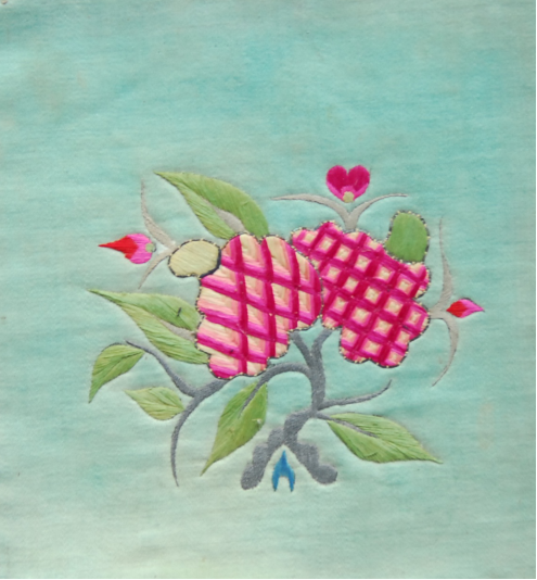 6.戮纱绣,也叫“穿纱”“纱绣”。以纱织物为底料,用色扣住纱孔即成。绣线在纱网眼间可做长短不同的扣绕纹。因受纱地组织的限制,花形状呈上下左右对称。