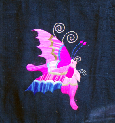 5.拽蜂,是在面料平底上绣制出立体的蝴蝶。由于绣工精细,找不出怎样连接绣制的地方,好像从布地子上拽出来的蜂,“拽蜂”之得名,古代称蝴蝶为蜂。