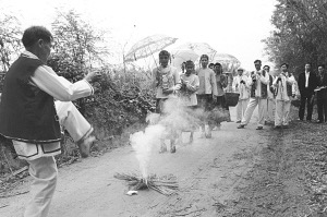 第二天一早,八音队在前面边走边吹长调曲,由8人组成的迎亲队伍一路欢歌笑语地来到新娘家村口。八音队要猛吹迎亲曲,新娘家的人才出来迎接。这时,村里的一位长者拿着一把稻草、少许米饭、一个鸡蛋,从村子走出来并缓缓点燃稻草,一边念咒语,一边向火堆抛鸡蛋。然后,迎亲队伍走过火堆才能进村。