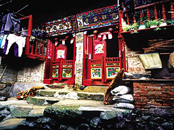 在大门至内厅的上面用木板铺成楼层,卧室在二楼,也放粮食和杂物。屋内左右山墙即是户与户间的隔墙,在墙中分别开有特殊的小门,邻居互通,称“隔门”。隔门平时关闭,遇特殊情况时,村中各户都打开隔门,变成室内通道,自由来往,整个村寨就是一座城堡。