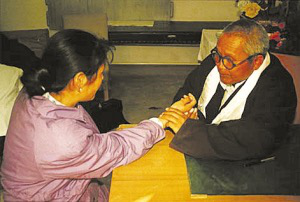 藏医正在为患者进行脉诊