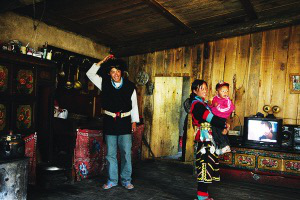在珞巴族家中,男主外,女主内,分工相当明确。当达瓦在家里和我聊天时,他的妻子群宗一直在忙碌着,忙着给我打酥油茶,忙着生火烧水、煮土豆,忙着照顾孩子。为了让我能拍一张达瓦一家人穿珞巴族服装的照片,大家费了好大劲儿。他们从东家借来帽子,从西家找来褂子,也有从南家借来的饰品……终于,达瓦和群宗夫妻俩都穿戴上了本民族的服饰,我如愿以偿地给他们拍了一张全家福。