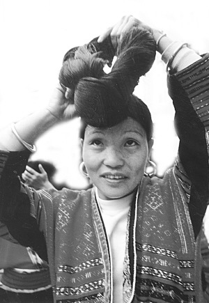 我们来到广西龙胜各族自治县和平乡黄洛红瑶寨时,还没有进寨,就看见三三两两的妇女在河水清清的河边洗头。她们梳洗着清亮的发丝,1.6米左右的头发又长又黑,飘飘洒洒。长发是红瑶女的一大特色,红瑶有世代相传的蓄发、护发、梳妆发型的秘方。红瑶女十二三岁开始蓄发,长到一定的长度可以剪下珍藏。等到30岁左右,就可以和秀发一同盘起。