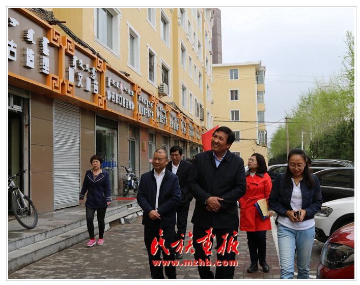 2017年5月3至4日,内蒙古自治区民委副主任萨楚日勒图(前左二)、语文处处长曹双喜(前左一)检查呼和浩特市的蒙汉双语牌匾情况(民族画报资料)