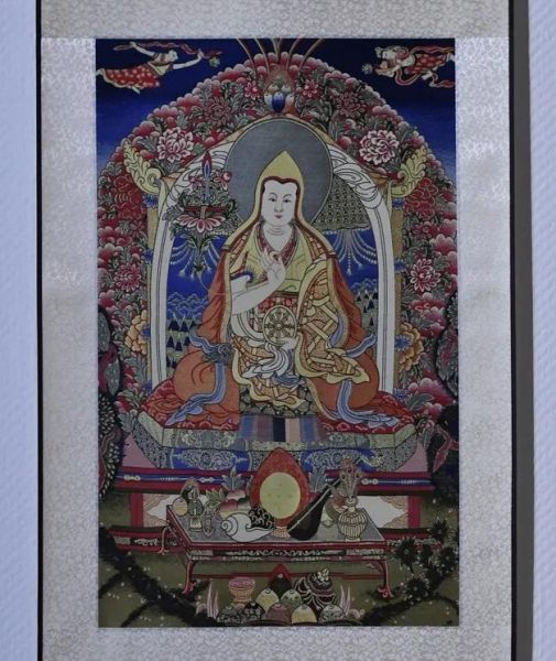 本作品的主体是藏传佛教格鲁派创始人宗喀巴。丰富的层次,饱满的花纹,使其成为独具风格的高档全真丝宋锦唐卡。