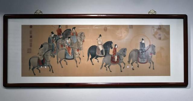取材于唐代画家张萱的画作《虢国夫人游春图》和《簪花仕女图》,作品采用横织竖裱的方式呈现。