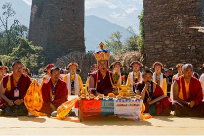 盘好发髻,佩戴好头饰,在肩、背系好五彩哈达后,由本村具有威望的女性长者引领来到仪式现场。法号声中,煨桑的青烟袅袅升起,威严的活佛主持诵经祈福仪式。随后,德高望重的长者为参加仪式的女子送祝福茶,长辈为姑娘们献哈达。一系列仪式结束后,无论男女老少,都来到场地中央,踏歌起舞,跳起吉祥的锅庄。