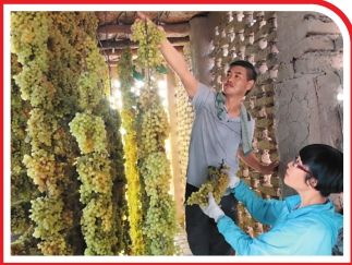 游客在吐鲁番市高昌区葡萄镇体验采摘晾制葡萄