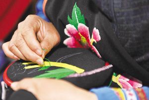 北川羌绣色彩艳丽明快,构图严谨大胆,体现出千年羌族文化的沉淀。 新华社记者 陈凯摄