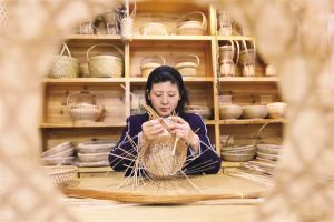 在贵州省赤水市一家竹编作坊,一名竹编艺人在编制果盘。 王长育摄