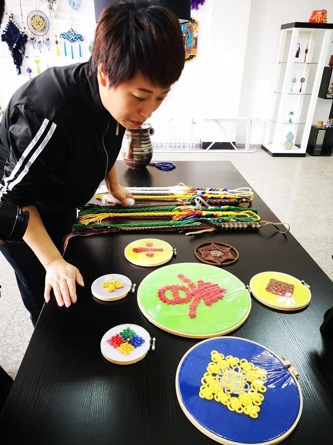 从小学习编织技艺的于云飞从2010年以技艺为基础创业之初到现在,每年都在对社会各个层面进行着宣传和培训,每年在各旗县、街道、学校等地都要免费进行传统结艺的宣传和技能培训,每年接受培训的人次达到上千余次,2014年到2016年间,在施介小学进行以“中国结,中国梦”的系统的宣传培训,让学校四年级到六年级的学生从小了解传统绳结文化,从小掌握绳结技艺。2016年至今,残疾人通过技术指导和培训,有五百余人掌握了技能;另外特殊群体中,有一批肾病患者在患病治疗期间,通过学习技术来充实自己,使他们得到社会的关爱,让生活丰富起来。