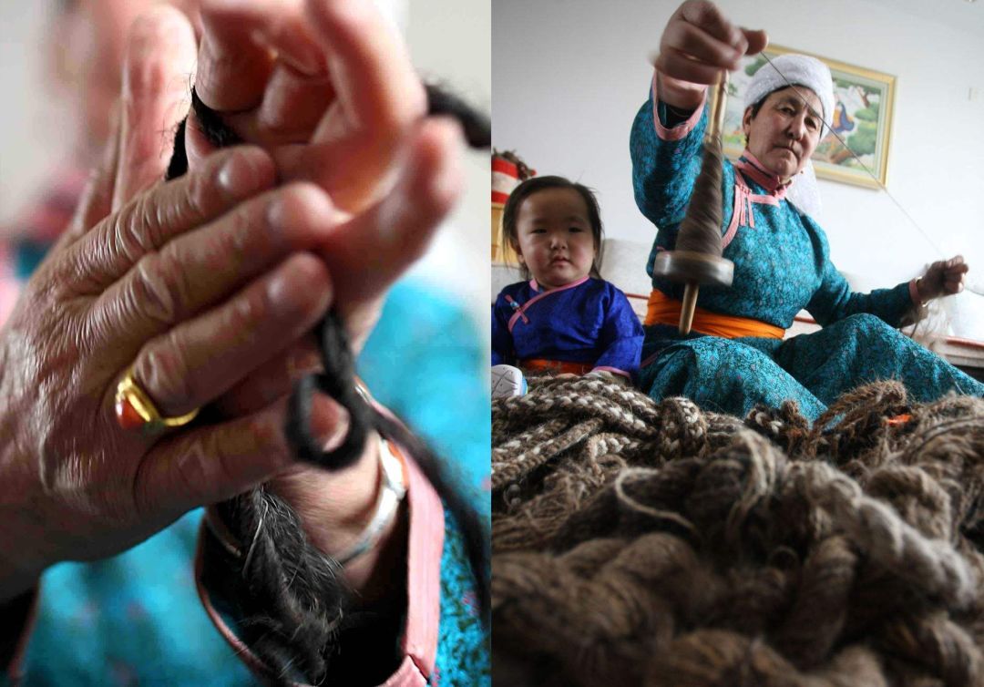 传统毡绣不仅用于工艺品,大多用在生产生活中。苏尼特毡绣技艺的绣制首先从制毡开始,大都在夏末秋初进行。材料多为驼绒线,而纺驼绒线则是用骆驼膝盖绒毛以及驼鬣的细绒手搓而成。