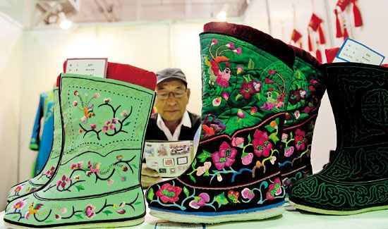 传统的毡绣工艺品包括吉祥图案、花纹图案、五畜图案、鲜花飞鸟、蒙古包门、毡包帡幪、马鞍屉、毡靴(毡袜)、坐垫、各种绣花毡囊、拾羔袋、驼鞍等。