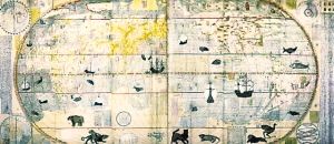 李之藻年轻时就对实学颇感兴趣,曾自行绘制过明朝两京十三省的地图。见到利玛窦用西法绘制的世界地图后,李之藻敏感地意识到,这个地图的绘制方法与中国传统的“计里画方”方法不同,是“取天文以准地度”,用经纬度确定地理方位。对利玛窦的学问一见而倾心的李之藻,每天都要到利玛窦的公寓学习地理、天文知识,每次都要花上四五个小时。1602年,李之藻与利玛窦结合中西绘图技术,合作绘制了一版世界地图《坤舆万国全图》,这幅地图改变了当时通行的将欧洲居于地图中央的西方绘图格局,把子午线向西移动170度,从而使东亚的中国居于地图的中央,并且全图标上了详细的汉字标识,这是中国最早的世界地图。