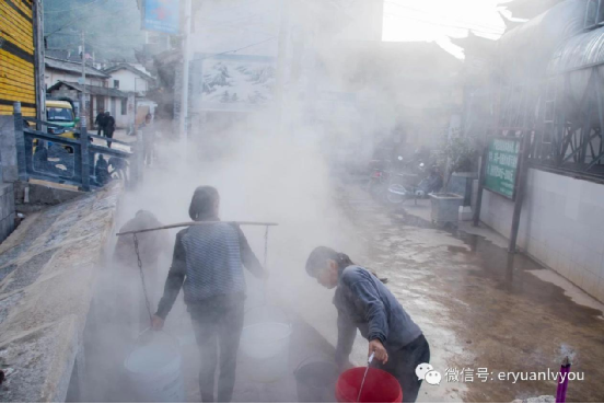 (洱源多处地下热水自然流出地表,当地人有早晚取用热水的传统习惯)