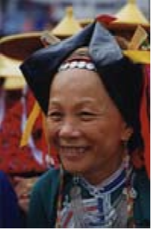 惠东老年妇女一般在脑后梳一发髻,近似长方形,然后套上发网,压平,左右各插一个别子,上方和中部各插一支梅花,再围上一条黑巾,用饰有珠花的别针别上。
