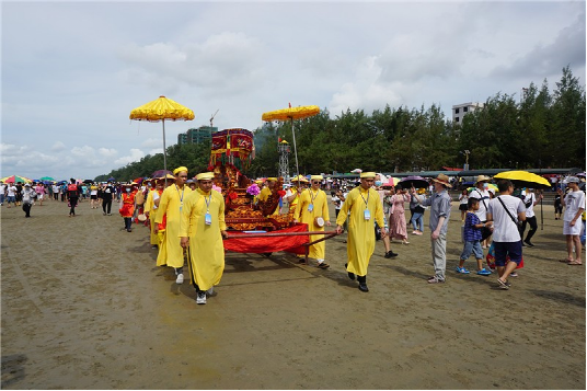 今年适逢中国共产党成立100周年,活动当天,氵万尾村洋溢着浓浓的爱国热情。活动开始,身着京族服饰的当地村民围聚在旗杆前,举行升国旗奏国歌仪式。随后迎神队伍在锣鼓和鞭炮声中到达海边,将“海神”迎回哈亭敬奉,祈求人畜兴旺,五谷丰登(见图)。众多慕名而来的区内外游客集聚哈亭和海边,与京族同胞一起欢庆这盛大的节日。