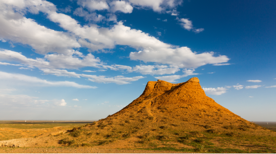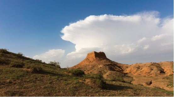 (东红烽火台,位于海南区巴音陶亥镇东红村,整体为红黏土夯筑而成,现高9.3米)
