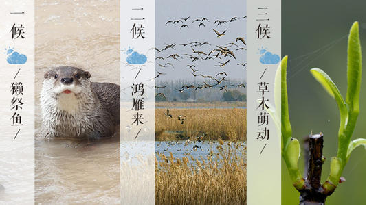我国古代将雨水分为三候:“一候獭祭鱼,二候鸿雁来,三候草木萌动。” 此节气,水獭开始捕鱼了,人们将鱼摆在岸边先祭祀后食用;五天过后,大雁开始从南方飞回北方;再过五天,在“润物细无声”的春雨中,草木因地中阳气的上腾而开始抽出嫩芽。从此,大地渐渐开始呈现出一派欣欣向荣的景象。
