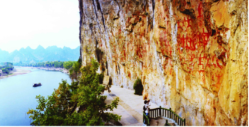 2.花山岩画景区,国家4A级旅游景区,位于宁明县城西北25公里的明江河畔。2016年7月15日,在世界遗产委员会第40次大会上,“中国广西左江花山岩画文化景观”成功列入世界文化遗产名录,这是广西第一处世界文化遗产,也是中国第一处岩画类世界文化遗产。