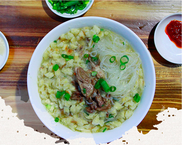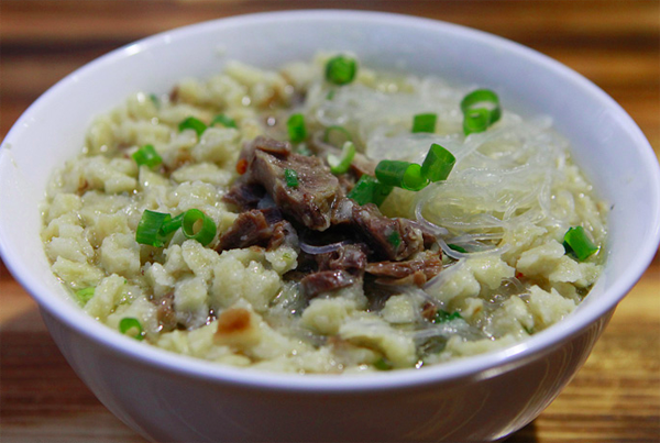 羊肉泡馍简称羊肉泡、泡馍,制作原料主要有羊肉、葱末、粉丝、糖蒜等,古称"羊羹",西北美馔,尤以陕西西安最享牛羊肉泡馍盛名,它烹制精细,料重味醇,肉烂汤浓,肥而不腻,营养丰富,香气四溢,诱人食欲,食后回味无穷。