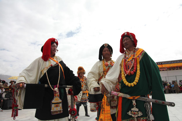 藏族分布在全国五省区,因气候、环境的不同,形成了丰富多彩的服饰文化。藏族服饰有“隔山两个样的”说法,有人统计,因地域、男女、年龄、婚否和季节的不同,藏族服饰有100多种。男装各地大同小异,上身穿宽大的藏袍,袖长及膝。束各种腰带。宽大的藏袍非常适应青藏高原多变的气候,露出右臂便于劳作,天热时将脱掉两袖,将藏袍扎在腰间,天冷时套上双袖。西藏人的服饰样式很多,有卫藏类服饰、康巴类服饰、安多类服饰和拉萨装。卫藏主要指除昌都地区以外的西藏大部分地区。西藏大部分地区的男装,主要衣料是氆氇,城镇人多穿黑色,农牧民多穿白色。康巴主要指西藏的昌都和青海的玉树、果洛一带。男子多内穿右襟齐脐短袄,外罩圆领宽袖长袍。头戴狐皮帽或“扎秀”(发辫缠红丝线),扎脚穿高筒靴显得英俊潇洒。女子穿长袖衫,外罩坎肩,腰束彩条围裙。讲究腰带和腰刀,腰带和腰刀上要镶嵌金银珠宝。女子多戴名贵饰品,显得华丽昂贵。安多藏区主要指西藏那曲与安多县接壤的地方。过去,男装衣领、袖口,下摆多饰虎豹皮,女装边饰多为水獭皮,而且项、腕、手指和腰间配有金银宝石饰物。
