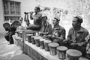 艾克山·艾尔肯对我笑着说:“你知道吗?传说纳格拉与西洋的定音鼓有着密切的关系。它们同起源于阿拉伯国家的罐鼓,在民间音乐中总是一大一小成对使用,以小槌敲击,发出‘咚哒’的音响,所以至今它的阿拉伯名字还叫做纳格拉。”