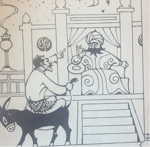 阿凡提一手举起毛驴的尾巴,一手指着国王的下巴,说道:“您的胡须恰好同我的毛驴尾巴上的毛一样多呀!”