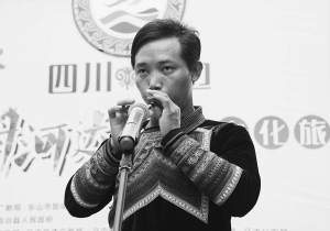 现年41岁的阿西日哈,是四川马边彝族自治县民建镇灯杆堡村的村民。这位多才多艺的彝族汉子不仅会吹奏木叶、草叶,而且精通月琴、马布,还会吹奏葫芦丝和笛子,可以称得上是一位全能乐器手。令人惊讶的是,这些乐器几乎都是阿西日哈自学的。