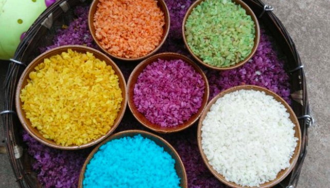 米饭常捏成饭团,便于携带,食之口味又别具一格。彩色糯米饭也捏成饭团,不同颜色的饭团陈列在一起,鲜艳夺目。彩色饭的色彩原料,不仅起到着色的作用,也起到调味的作用,不同的色饭有不同的香味。米饭经着色处理后,不易馊、不易坏,米饭着色起到了防腐、保鲜的作用。