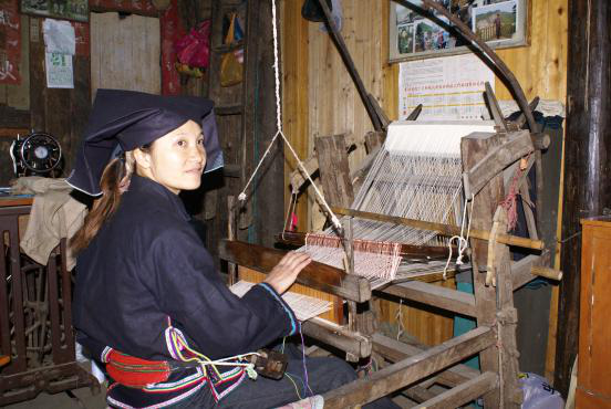 从前壮族乡村,普遍掌握制作蓝靛及印染方法。一般置一大缸,将蓝草放入浸泡,加石灰使之分解、发酵,经过化学变化,而后滤去残渣,蒸发水分,凝成糊状蓝色染料。其间需不断搅动,使色素充分化解。“每靛草六百斤,造成一百斤之靛为佳。”因产量较多,远销广东。浸染时,将适量靛糊化于染缸中,同时将鸡血藤捣碎加入。布要反复浸泡多次,晾泡结合,直到染为深蓝色。其间鸡血藤释放出一种紫红色的植物胶,将蓝靛色素粘在纤维上,是色素耐水耐腐耐紫外线,不易褪色,并有若隐若现的亮点,结实美观。这个过程,运用了化学分解法。