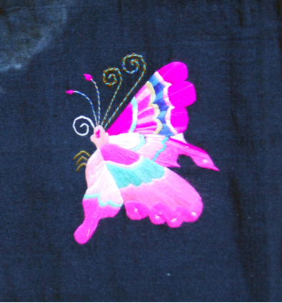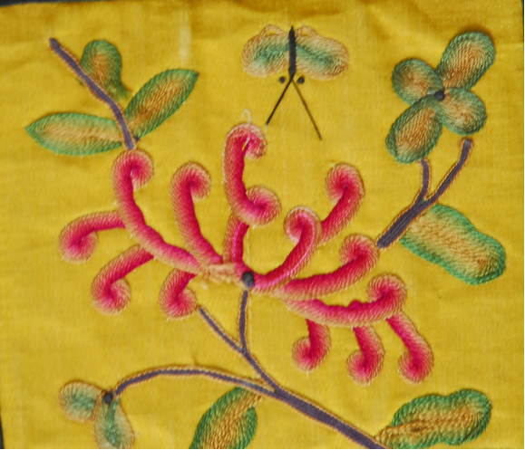 5.拽蜂,是在面料平底上绣制出立体的蝴蝶。由于绣工精细,找不出怎样连接绣制的地方,好像从布地子上拽出来的蜂,“拽蜂”之得名,古代称蝴蝶为蜂。