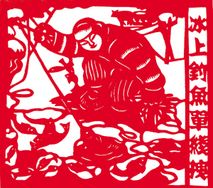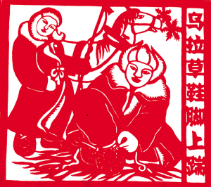 满族风情剪纸《冰上钓鱼单线拽》