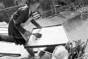 占里村共有182户827人,这里的侗族古法造纸术源远流长,全村从事造纸业的就有170户,占总户数的93%。这里的造纸业依然保留着原始的家庭作坊和世代传承的手工制作方式。这种古法造纸技艺以构树皮为原材料,添加猕猴桃藤、野棉花根,经过水浸泡、石灰腌制、蒸煮、碓烂、摊晒、烧碱漂白、打浆、沥水、抄纸、烤干等72道工序,最终制成白皮纸。